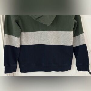 Stylish color block hoodie with OshKosh logo- size boys 14. Comfortable and perfect for casual wear. Previously owed, washed a few times to be freshened up but never worn. There’s some visible washing wear, otherwise, it is in good condition overall. Made of 80% cotton & 20% polyester.