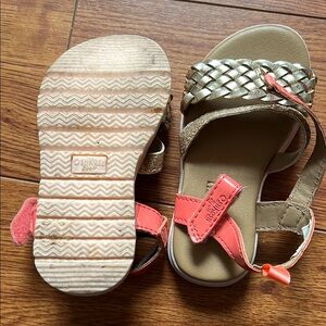 Stylish kids sandals featuring a vibrant coral and elegant gold design. Perfect for any occasion.