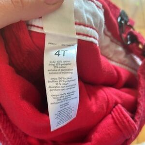Bright red corduroy overalls with adjustable straps and button details.