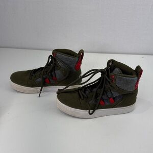 These trendy high-top sneakers for kids feature a stylish olive and red design, perfect for everyday adventures. Comfortable and durable, they are ideal for active play.