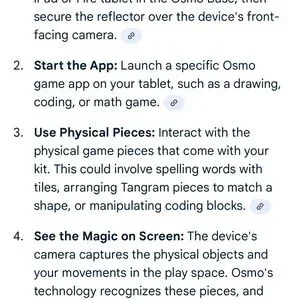 The Osmo system works by using your iPad or Fire tablet's front-facing camera, a stand with a reflector, and the physical game pieces to create an interactive learning experience. The system uses what Osmo calls "Reflective AI" to scan the physical game pieces and the user's actions, bringing the digital game to life on the screen and providing immediate, interactive feedback. This allows children to learn through hands-on play, combining physical objects with engaging digital apps to teach skills like coding, drawing, and math.