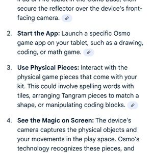 The Osmo system works by using your iPad or Fire tablet's front-facing camera, a stand with a reflector, and the physical game pieces to create an interactive learning experience. The system uses what Osmo calls "Reflective AI" to scan the physical game pieces and the user's actions, bringing the digital game to life on the screen and providing immediate, interactive feedback. This allows children to learn through hands-on play, combining physical objects with engaging digital apps to teach skills like coding, drawing, and math.