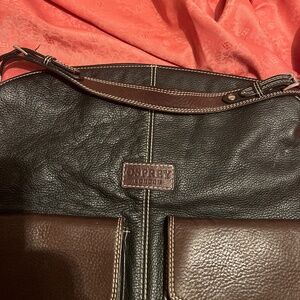 Osprey by Graeme Ellisdon pebbled, two tone large satchel bag in excellent, like new condition. The quality and attention to detail is evident in every aspect of this Graeme Ellisdon pebbled leather bag.