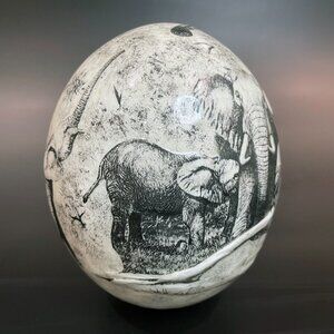 Ostrich Egg with Hand Drawn African Elephants. 5.5" x 5.5" x 7.5"