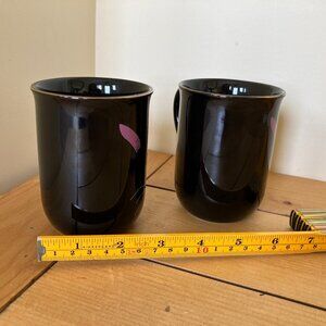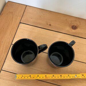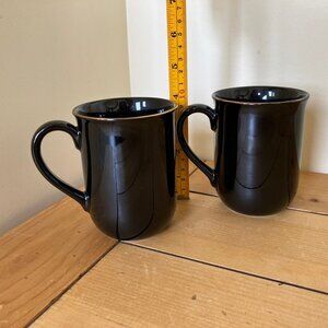 Otagiri Set of 2 vintage black ceramic mugs have a cat face design on one side. Mugs are approx. 4" tall x 3" across top rim (not including handle) and hold up to 8oz. Bottom of mugs have Otagiri Japan logo & designer name (Cheryl Fleischer). Good pre-owned condition, gold rim is worn away in a few places on each mug.