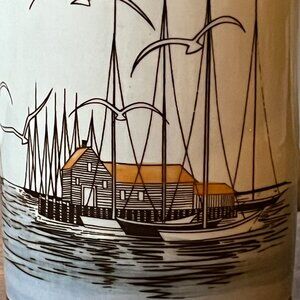⛵ This is a vintage Otagiri stoneware mug from the 1960s-1980s, handcrafted in Japan. The mug has a nautical-themed design, featuring sailboats docked at a boathouse or wharf with seagulls flying overhead. Many Otagiri mugs are known for their unique, hand-painted designs with a smooth, raised texture, making them popular with collectors.