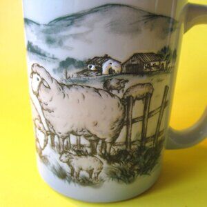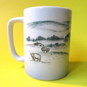 Vintage Otagiri mug with country view scenery showing hills, homestead and sheep. White mug. Clean and without any damage. Pastel colour scenery.