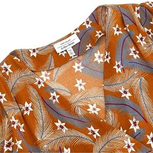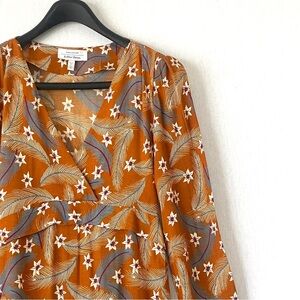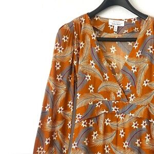 This is a long-sleeved, v-neck midi dress with a burnt orange background and a floral and feather print. The dress is from the brand & Other Stories Paris Atelier line. The dress features a wrap- style bodice with a self tie at waist and long sleeves with buttoned cuffs. Perfect for any occasions.