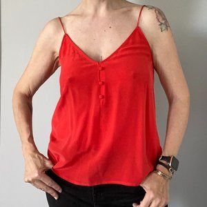 3 faux buttons (as in, you can't unbutton them) down the front, with think spaghetti straps (not adjustable)