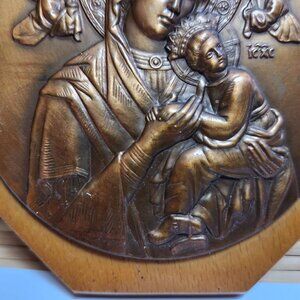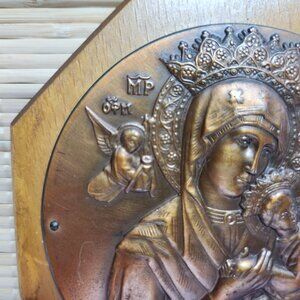 Our Lady of Perpetual Help Virgin Mary Religious Copper Wall Hanging Oak Base