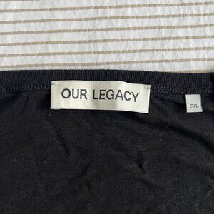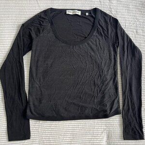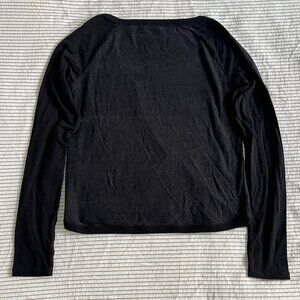 Super soft slim-fitting long sleeve top with deep open neckline from Our Legacy. Basically unworn as doesn't fit me. Looks solid black in ecomm photos but actually has a slight contrast with the slight fuzzy dark grey body and smooth black sleeves. Fiber content: 86% Tencel 10% Cashmere 4% Elastane