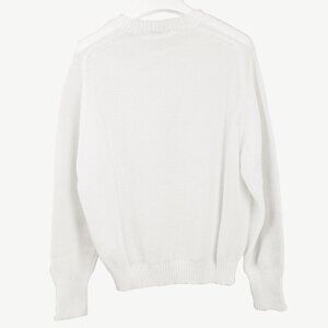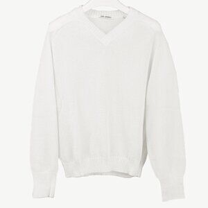 Circa 2019, this sweater from Our Legacy is crafted in a White semi-sheer bubble knit, and features long sleeves, raglan shoulders, a V-neck, tonal stitching; and a rib knit on the cuffs, neckline, and banded hem.