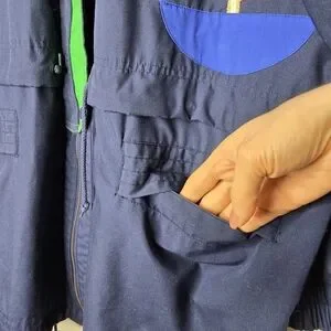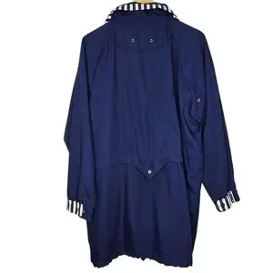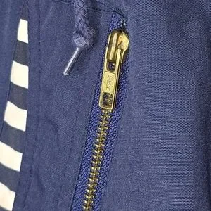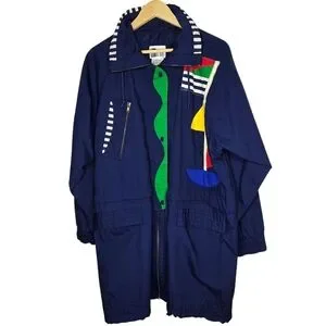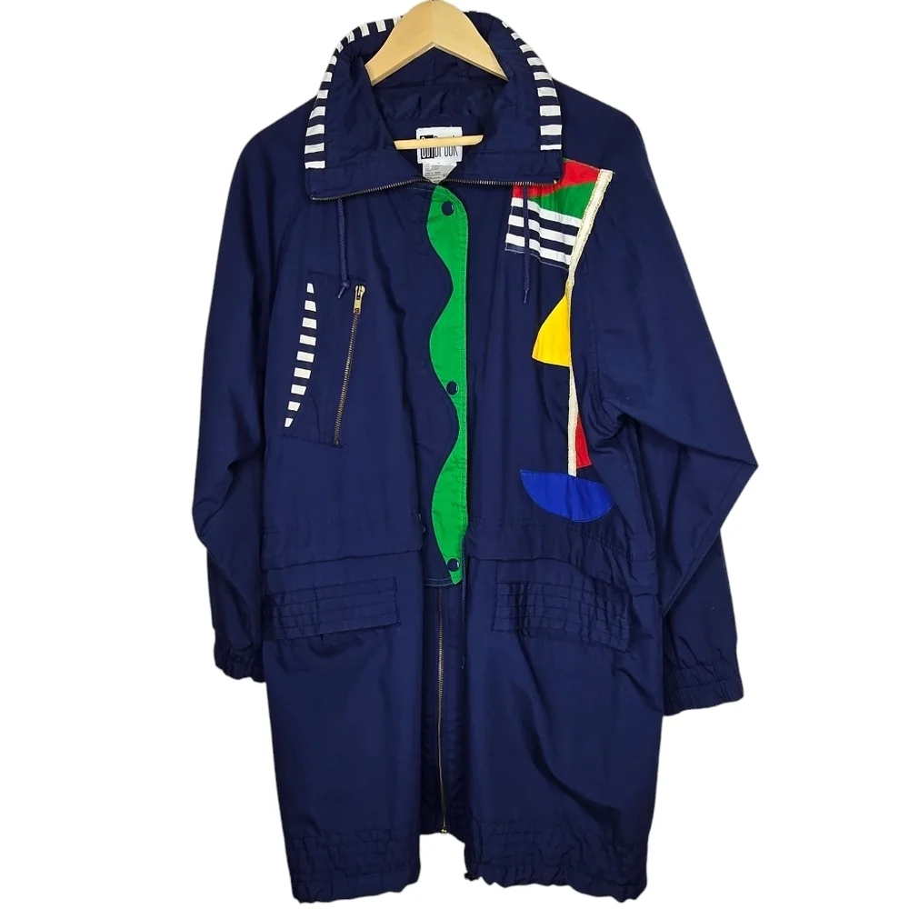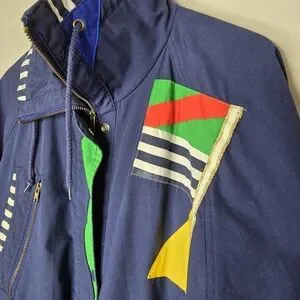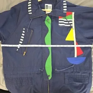 Navy blue windbreaker. Features colourful geometric panels. Long sleeves, zipper closure. Pockets. Striped inner collar and cuffs.