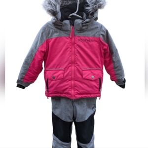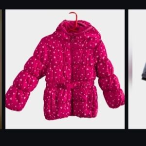 Set of three kids' outdoor jackets/ suit. Includes pink with butterfly print, pink with polka dots, and gray with pink accents. Perfect for cold weather.