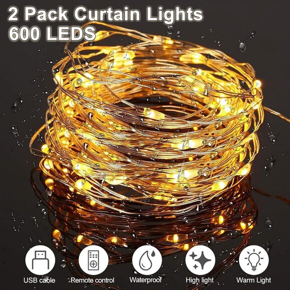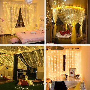 【Curtain Fairy Lights】: Measuring 9.8 ft x 9.8 ft (3 m x 3 m), equipped with 300 super bright LED on 10 drop strings and come with 10 hooks. High-quality copper wire could be easily built to any shape you desire. And these flexible mini curtain lights can provide a comfortable and relaxing environment without disturbing your eyes, creating a very dreamy room.