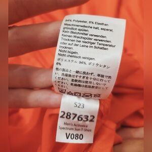 Outdoor Research Men's ActiveIce Spectrum Sun T-Shirt. Short sleeves. Round Collar. Blue logo at the front. Bright Orange. Size XL, see pictures for measurements. SPF 50+. Fabric is soft,, comfy and stretch. Faint small stain around the collar as seen on pictures. No rip, no hole. Non smoking house.