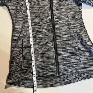 Slimming jacket with back waist designed fabric element. Convenient two way front zipper, two inner and outer pockets, great workout jacket includes thumb holes in wristbands. Easy to dress up as this cozy jacket is complete with a stylish turtleneck collar.