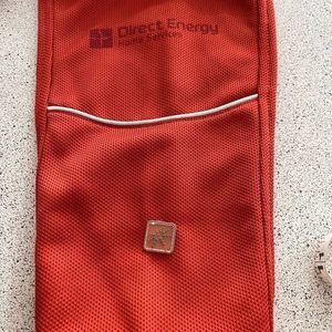 This orange zippered jacket by Outer Boundary has 2 side zippered pockets and 2 large inside pockets. It has the Direct Energy home services logo on the right arm.