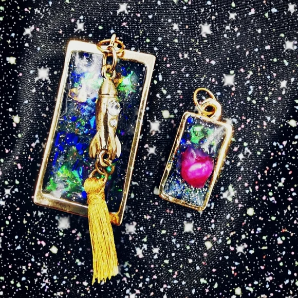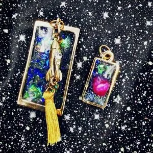 Handmade UV Resin set of two gold plated rectangular pendants with multicolor designs to look as the space galaxy. Features a tassel on the gold spaceship and a astroid detail.