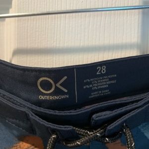 Outerknown men’s swim short, navy blue with colourful pattern.