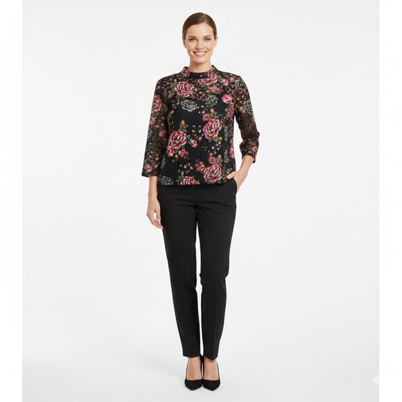 Elegant and vibrant, this Outfitters floral lace blouse features red and green floral patterns on a classic black base. Designed with long sleeves and a keyhole button closure at the back, it can be layered with a tank or bralette for versatile styling.