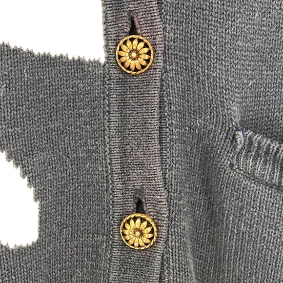 Cute knit button up sweater with a deep v-neck and two large flowers patterned into the sides (torso and shoulder).