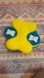 Bright yellow dog feeder in a fun bone shape. Includes white bone-shaped pieces for interactive play. Perfect for engaging pets during mealtime.