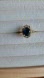 This exquisite vintage style gold tone ring showcases a deep blue synthetic sapphire stone surrounded by sparkling crystal accents. A perfect piece to elevate your style.