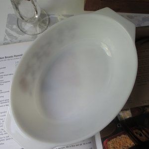 This vintage Pyrex oval casserole dish with a classic vine floral pattern. The dish has two handles and a smoky brown glass lid. This model was produced in England between 1983 and 1985. Pyrex England is marked on the bottom of the pot, same on the lid.