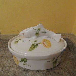 Nice oval dish/bowl, lidded, with fish handle. Decorated with butterflies and flowers.