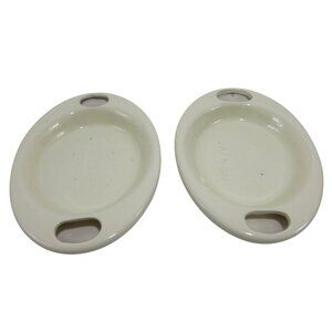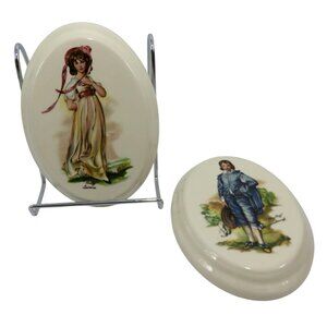 This set of two ceramic wall plaques features detailed colonial-style artwork on an oval design.