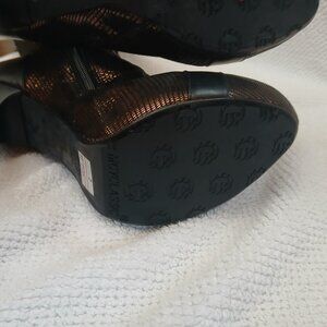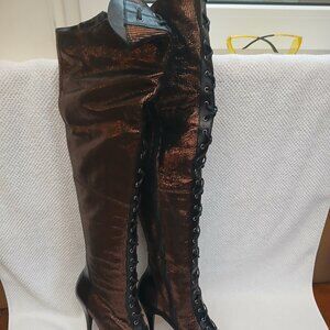 An exciting boot tailored just for the woman who demands a little excitement in her life. 28" tall, 1" platform, over-the-knee design. 4" heel. A lace up design , 15" girth at the top of this boot. Striated bronze leather with black leather contrast and black laces. Not for everyone, but for the girl who likes verve and elan , it's perfect! New and unworn. Hand made in Italy.