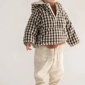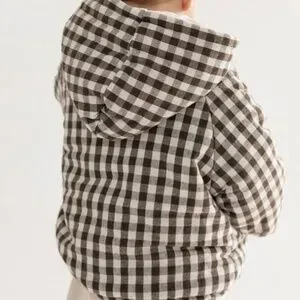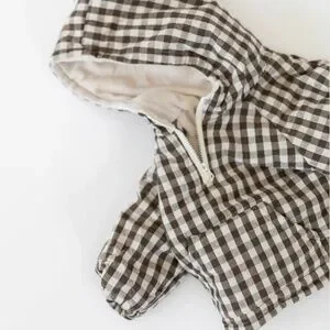This gingham half- zipper pullover in cream and brown gingham boasts a soft fleece lining and a plush hood. The added bonus of a kangaroo front pocket adds convenience to this playful spring jacket.