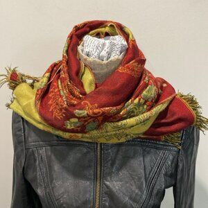 Women’s Floral Mustard Yellow, and Red Weaved Textured Scarf with fringe