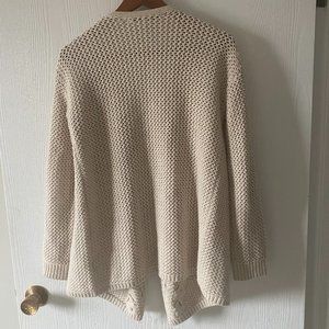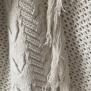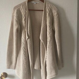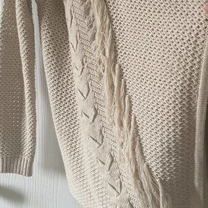 Beautiful Guess heavy knit sweater with fringes down both sides and crossed lacing (see photos). Neutral colour. Worn once and in excellent condition. Approximate length in front is 28 inches and 26 inches in back. Pit to pit is approximately18 inches. Warm cardigan for those cool days. Dry clean only.