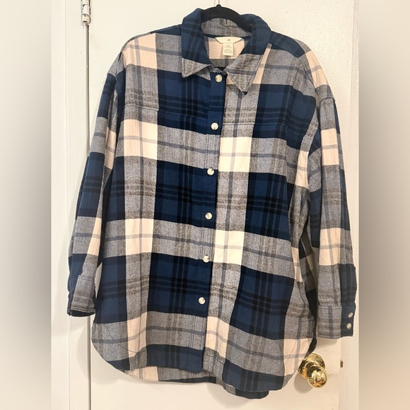 Oversized H&M Navy and Cream Plaid Flannel Shirt
