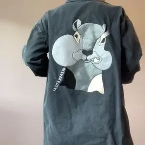 Ulease & Tieai gray ovsersized jean jacket with cute squirrel print on the back. Excellent condition.