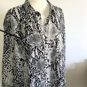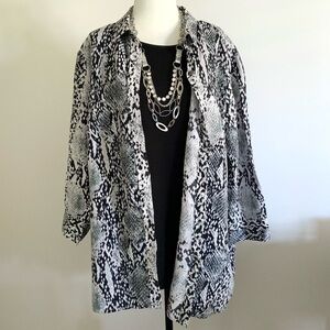 Jones New York Sport button up collared overshirt in black/grey/white reptile print.