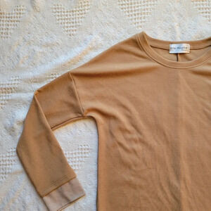 Ribbed, crew-neck, long sleeves with contrast cuffs, dropped shoulders, contrast shirt type hem with button closure, unlined, relaxed fit, semi-stretchy, mini length, casual, stylish, simple but chic.