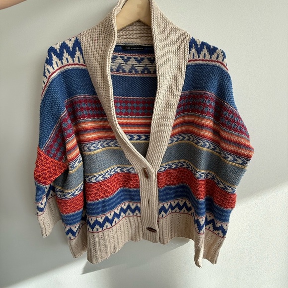 Stay stylish and warm with this multicolor patterned cardigan. Perfect for any casual outing. Missing middle button!