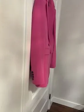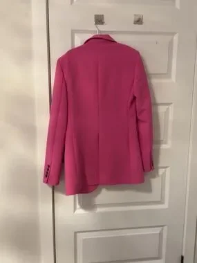Hot pink blazer with black accents and centre vent.