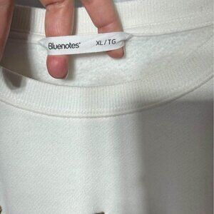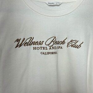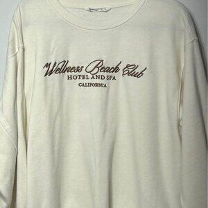 Oversized crew neck sweatshirt. Size XL. Cream/brown. “Wellness beach club”.