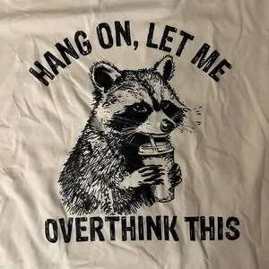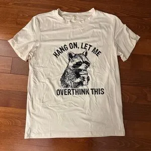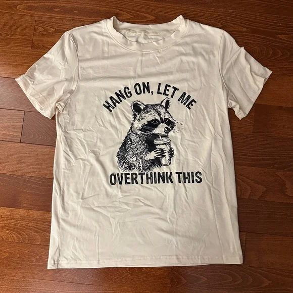 Classic off-white short-sleeve graphic tee featuring black raccoon illustration with text "Hang On, Let Me Overthink This". Soft, breathable fabric with a relaxed fit. Pairs easily with jeans or leggings for a casual everyday look