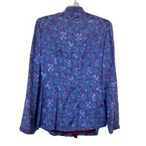 Vintage Owens Bros oriental fitted jacket in a periwinkle blue brocade satin with burgundy floral pattern. Classic frog closures with stitching details that accent the fitted design of the jacket. Has pockets at the front of hips. Fully lined in burgundy fabric. Tag doesn't note a size, fits like a like a women's "medium". See measurements below. Pre-owned vintage condition: fabric has fading along shoulder seam as shown in close-up photo. Red lining has a small hole in the center of the back (not visible from outside of jacket).