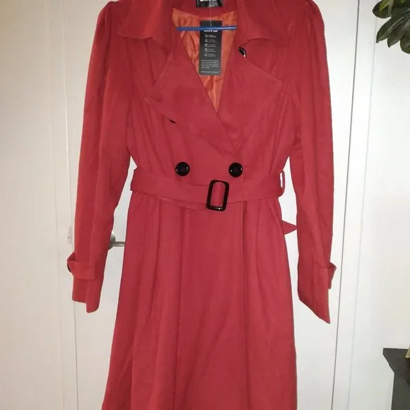 Owind brand, Smart Looking Red Double Breasted Trench Coat, Black buttons and buckle, Size XL (fits smaller), Polyester