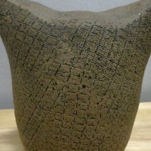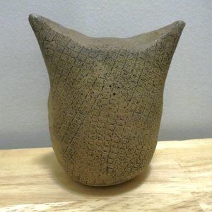 Unusual ceramic/pottery stylized owl. Would make an interesting paperweight. Has a textured granite stone like finish. Signed by artist Judy Truman. Size: 4 1/2" H x 3 3/4" W