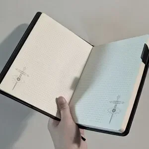Brand new, never used. Atlas Six inspired notebook with cover featuring quotes from The Atlas Six, as well as the sigil on the inner pages. There's also a pen loop to hold your pen as you travel with your notebook.