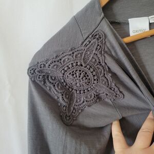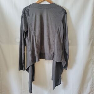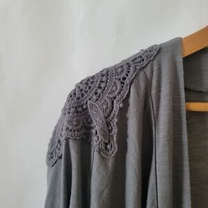 Stay cozy and stylish with this elegant gray open front cardigan sweater. Perfect for layering, this versatile piece adds a touch of sophistication to any outfit. Sweet crochet shoulder decorations. EUC