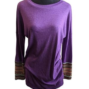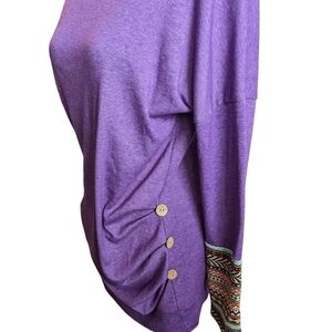 oyamiki women's long sleeved shirt with boho inspired cuffs in purple size small. soft material with button detail on left hand side. Cottage wear. loose fitting top ruching on left hand side