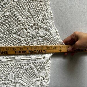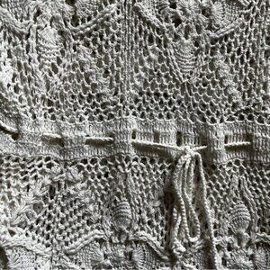 Chic crochet knit dress in a soft cream color. Features intricate patterns and a flattering fit. String tie on waist line. Great resort wear/ swim cover up.